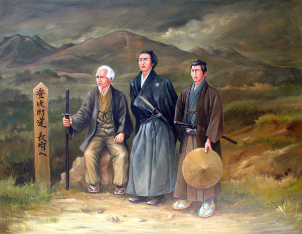 下の絵は 空想画ですが 左より勝海舟・坂本龍馬・吉田松陰が久住を背景に立つ姿です。