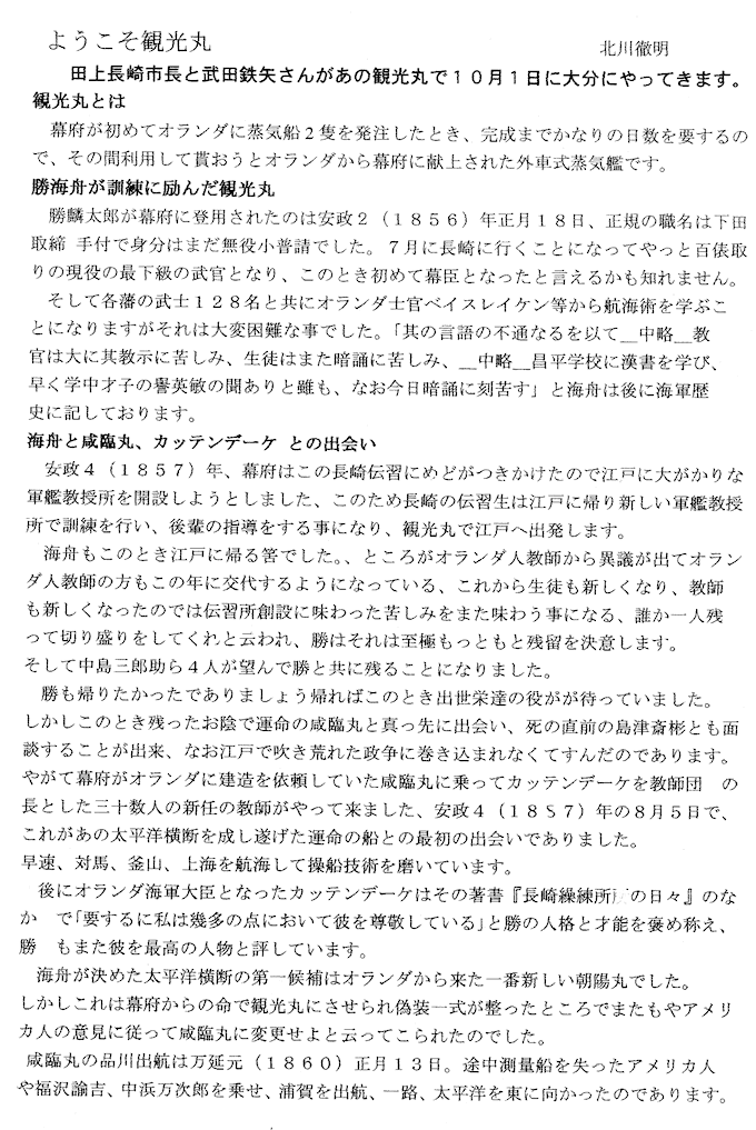 日本海事史学会会員で『幕末の蒸気船物語』という著作のある元綱数道氏は、鶴崎の郷土史家北川徹明氏からの