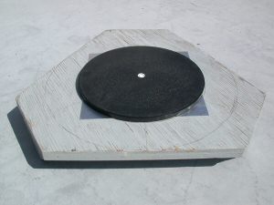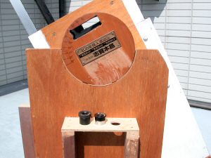 | 天頂から水平までフリーストップ水平には360度向けられるドブソニアン望遠鏡です 望遠鏡本体の重心がこの丸い円形板内に入るように作ることが大事です |