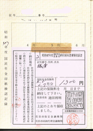 当時、国民年金は市役所が管理徴収していました、当時は地元の納税組合の集金の方に支払っていました。