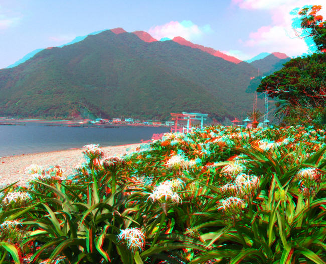 海岸にハマユウが見られる夏が来ました。 蒲江の江武戸海岸にハマユウを立体撮影するために来ました。