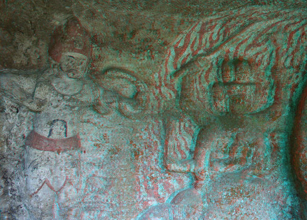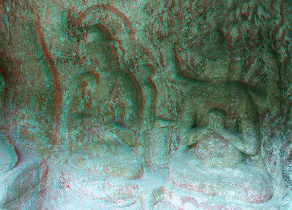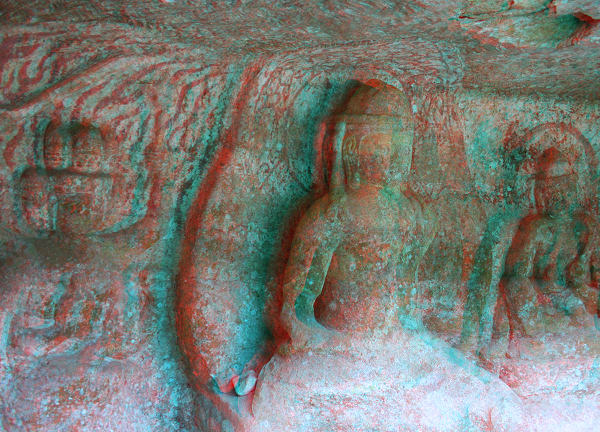 立体写真だからこそこの磨崖仏の姿を見せられます。是非赤青メガネでご覧ください。