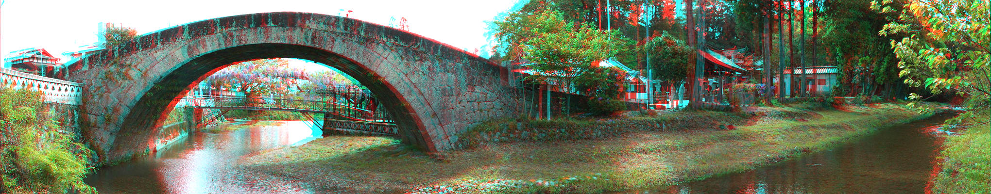 立体写真で西寒多神社の石橋と西寒多川