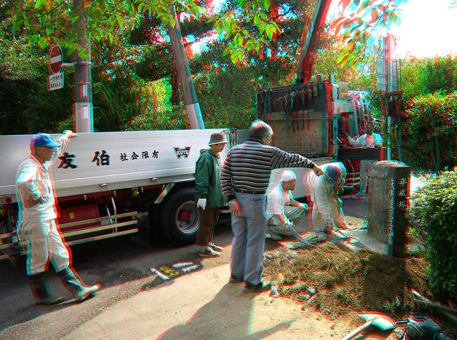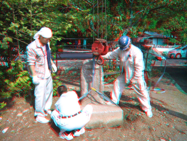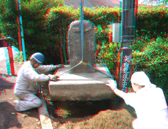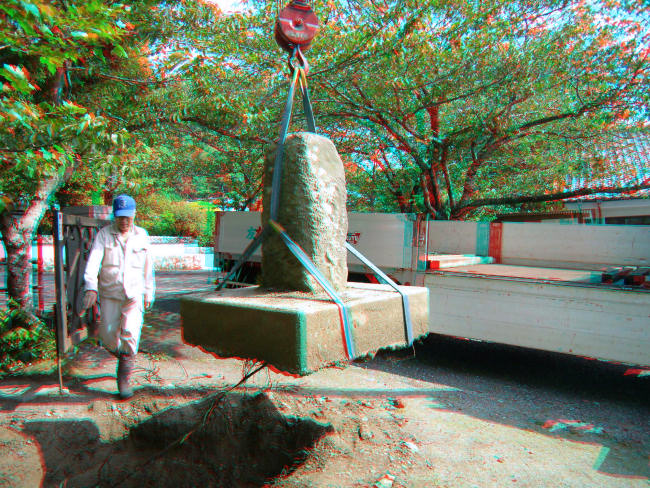 今度は矢野龍渓生家跡の地にあらかじめ穴を掘って準備した場所へ慎重に降ろします