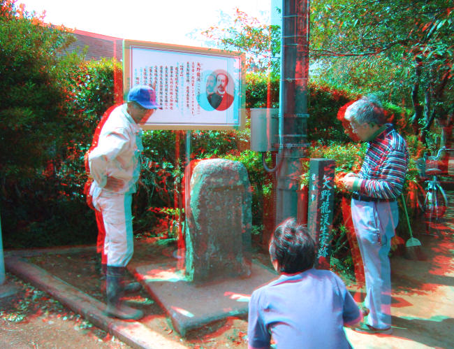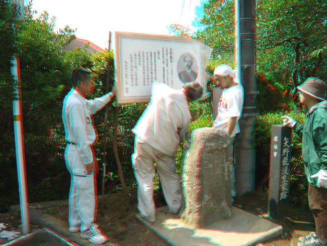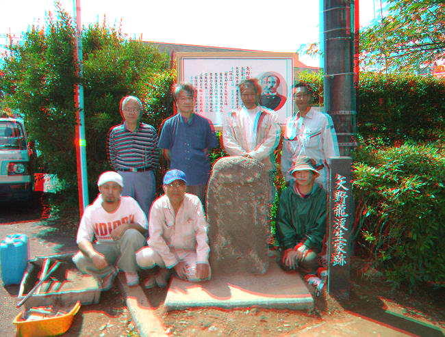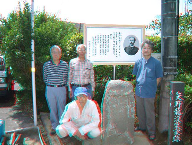 新しくできた看板と矢野龍渓石碑前で記念撮影