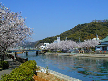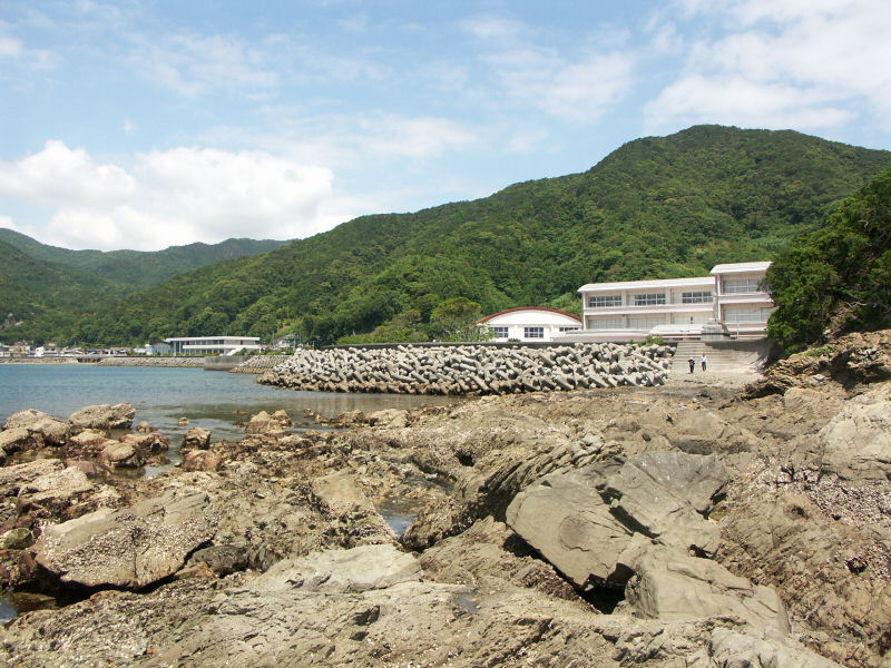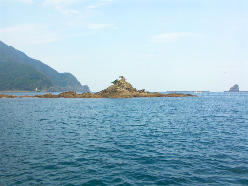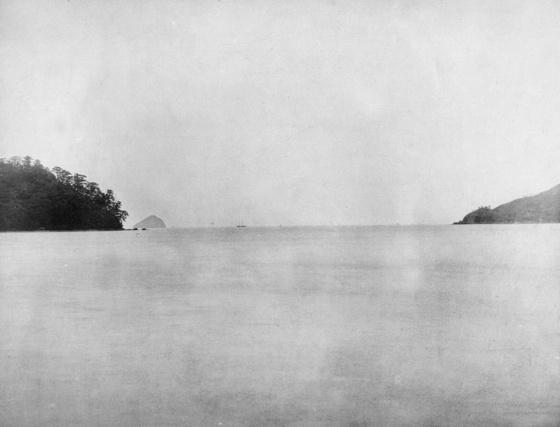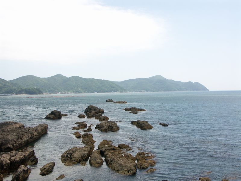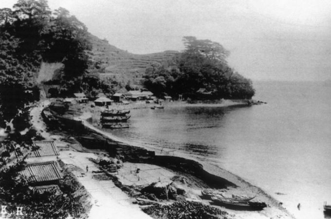 入津湾 今のパノラマ湾は大南に面せり神武天皇東征し給ふや途次舟師此所に泊す上陸し給ふの地をヱムト鼻と称す湾内水清く且つ深し中央に浅所あり俗称彌治郎貝を産す本郡の名物なり |