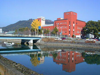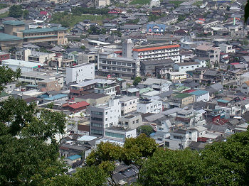 萩山より鶴屋城山并に城下を望む郡の主府にして毛利氏変世據る所なり商業頗る繁昌す郡役所、区裁判所、警察署、税務署、郵便電信局、銀行、寺院、学校等あり番匠川は西南を環流し大江灘川は其南に流る慶長六年毛利伊勢守高政氏の封せらるるや地を鶴屋に相し居城を新築す山形鶴翼を張る如し故に鶴城と称す舊鶴を殺すを国禁とす依て白鶴丹項四時群を為すと |