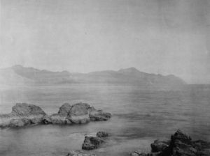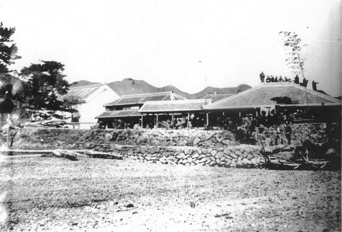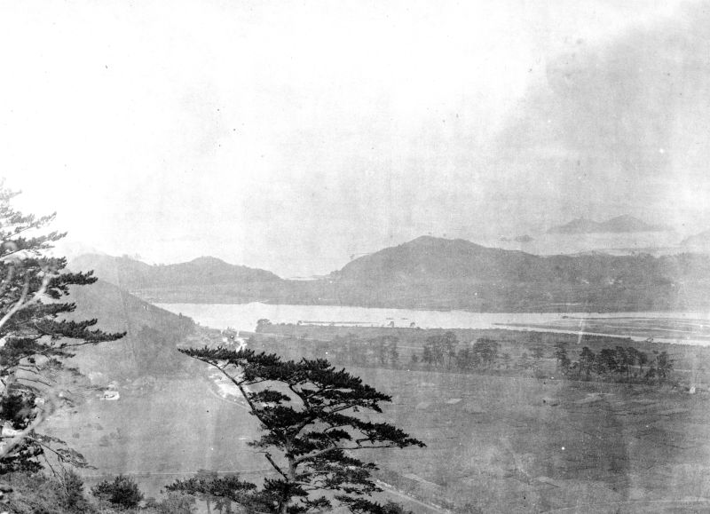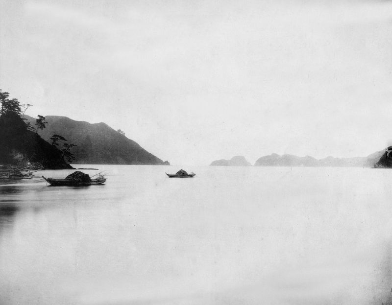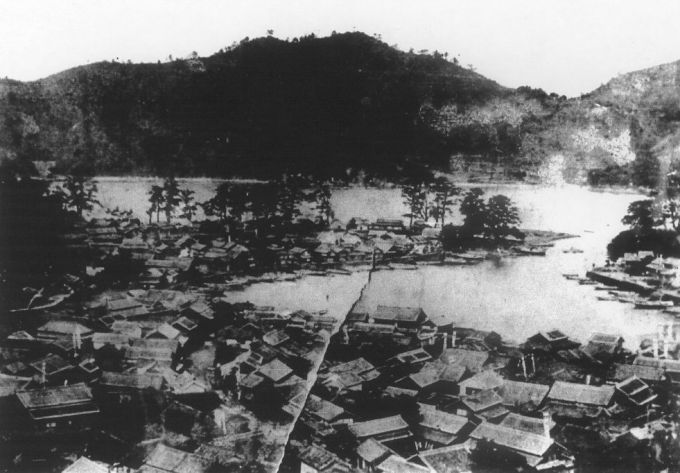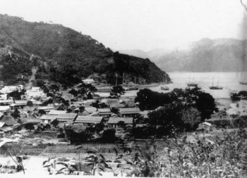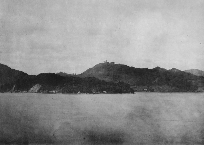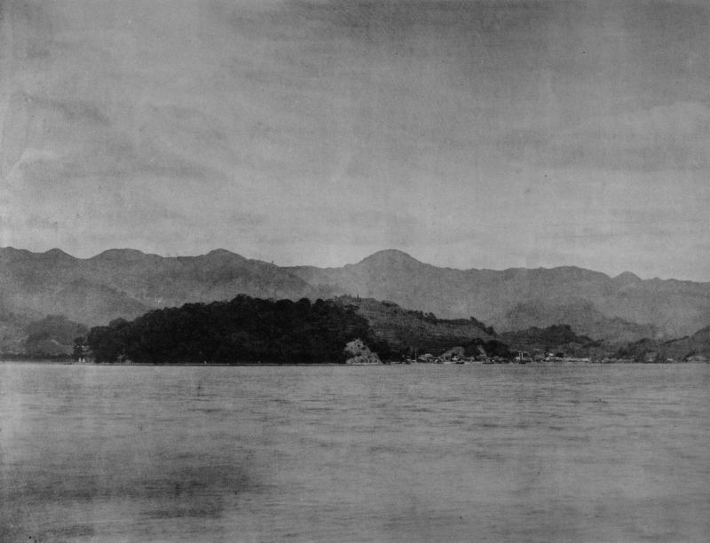 蒲江港湾 今のパノラマ本郡第二の都会漁魚の盛なるを以て名あり電信局の設けあり湾内能く風波を避け汽船を入るるに足る |