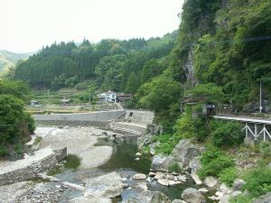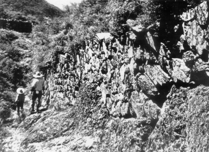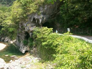 因尾の洞窟因尾村井の上に一洞窟在り絶壁の中間に穿たれ窟内恰も石を以て畳むが如し空濶凡そ百人を容る可し洞外は群山高く従へ洞下に寺あり宿善寺と名く叉前面に深潭あり鐘ヶ淵と云ふ天正十四年十一月薩兵此洞下を経て丹生島城に至らんとす因尾の土民数十名糧食を裏んて縄梯を持ち此洞窟を臍り大木立石を洞外に懸け敵兵の来り過くるを待つ巳にして薩兵七百余来り渦く土民鯨波を挙け一斉に石木を役下す薩兵圧死せらるるもの百余爾後薩兵恐れて敢て此間道を過きすと云ふ |