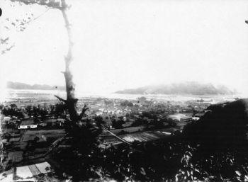 宇山の古城祉より柏江の古戦場を望む 今のパノラマ嘉吉元年八月大内義隆海を越て大友新治を攻むるや舟手を佐伯に分かち海浜に火を放ち人を殺す算なし頗る惨烈を極む民間恐怖甚し大内来を唱て児啼時を遏るに至る城主佐伯讃岐守惟世其残虐を忿り誘て柏江港に敵船を集めしめ故さらに寡兵を宇山に出し又城山及ひ樺現山八幡山に兵を伏せて待つ敵寡兵を侮り上陸来り攻む権現山の兵別路より柏江に進み敵の退路を断つ依て我兵一時に起り四面包撃其遁るるを逐ひ残兵を潮水に墜落せしめ兵船三百を焼き大勝を得たり |