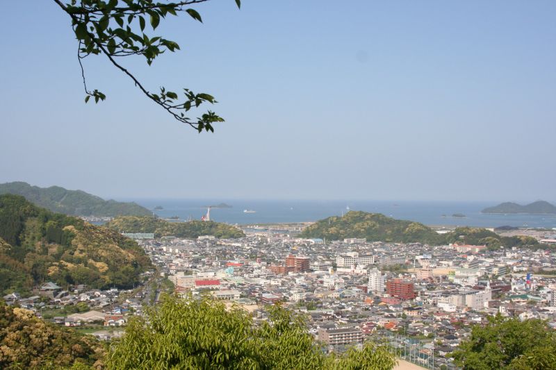 城山より佐伯湾を望む 今のパノラマ北蒲戸崎南鶴見崎遥かに相対して一大湾を作す佐伯湾是なり此間大島大入島屋島群島竹島双子島等大小無数の島嶼あり雄大の風景本州第一と称す |