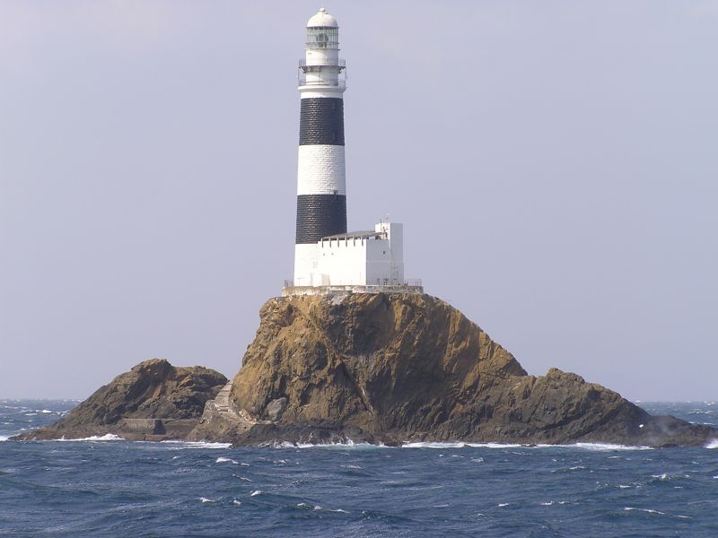 水の子灯台一に日振島と称す周囲三丁余りの小島にして梶寄村よら東北七里の海心にあり古は宇和島佐伯二藩の領境とす燈台は明治三十四年三月起工三十七年三月落成高十八丈余六萬八千八百燭光の旋転燈なり毎三十秒一閃白光を発し二十海里を照す工費弐拾萬円と云本邦第一の一等燈台たり |