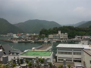 八幡并に代後宮の内 今のパノラマ地は八幡村に在り嘉吉元年大内氏の舟師佐伯を攻むるや一軍を宮の内代後より上陸せんとす城主惟世伏兵を設け稗将をして陽に敗走せしむ敵兵来り逐ふ伏兵一時に起り大に之を敗ると云ふなを又八幡宮あり大同年間の創設と云ふ例年八月中旬大祭あり舟を艤して蝟集し郡内第一の盛祭と称す |