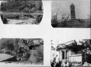 古市石塔鶴岡村古市に在り年代審ならず方四尺高さ二丈五尺余十三層方なり四面悉く彿像を刻す古色蒼然数百年前の物なるべし蓋佐伯惟冶以前の寺蹟少なからず古塔所在を道成寺と称す其上方に長雲寺光明寺の趾あり前面脇村の山上に一上寺二上寺山上寺の趾あり輪塔の残片を見る常時佛法の盛なるを知るべし 尺間神社 今のパノラマ大坂本尺間山上に在り養老元年六月二十四日神托に因て山城国愛宕神社の神霊を勧請成す 釣り橋 今のパノラマ因尾川の上流中野村に在り、明治三十一年の新設なり古来の難路頓に易行の道となる 彿座 今のパノラマ因尾道路に在り、因尾川に岩骨突出して道を塞ぐ、岩の間自ら空洞道をなす |