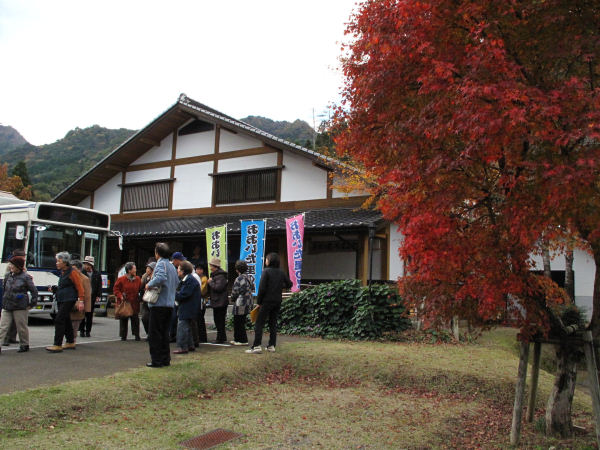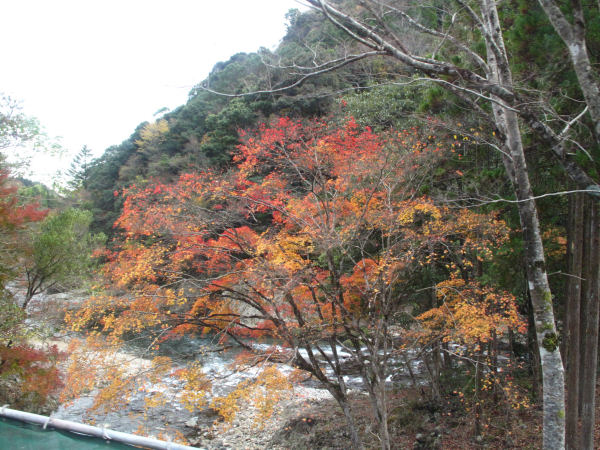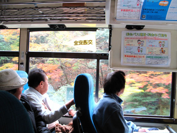バス2台で10号線を南下 鐙(あぶみ)川沿いの紅葉をバスの車窓から眺めながら北川まで下り