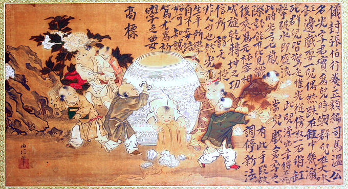| 司馬温公水缸(みずがめ)を毀(こぼ)つの図 北宋の名臣・司馬温公が少年の頃、石を持ってみずがめを破り、 溺死しようとしている子どもを救ったという逸話から取材した狩野由信の絵です、 藩校「四教堂」に掲げられていたそうですが 今は佐伯小学校校長室にあります この絵の余白部分に毛利高標が絵の説明を書き入れています 貴重な文化財です。 ![]() この貴重な絵を見る参加者 ![]() |