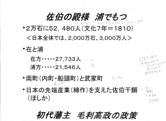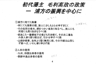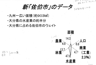 | 佐伯市は面積に比べて同比率の産業は林業 人口や商業販売額 工業出荷額などは低く 農業は耕地面積が低い割には頑張っている 水産業は大分県の半分も占めている点が特徴である 江戸時代の調査で佐伯藩は2万石 その当時日本全体では2000万石 それから考えれば 佐伯藩の人口は3万人のはずだが 52480人の人口があった事などから これだけの人が生活出来るのだから 佐伯藩は豊かな生活をしていたのだろう 当時から佐伯藩の財政を支えていたのは海産業とくに 鰯を干した「ほしか」という肥料が 日本の綿栽培における肥料として全国に販売されていたお話 毛利藩の政策や難破船を奉行所が取り調べたときの調書などの古文書から 当時の船が何をどこから何処へ運んでいたか解明できる話など 具体的に数字など示して 毛利藩時代の話をわかりやすくしてくださいました。 そういう意味で「ルネッサンス」という言葉が今回のテーマとなったようです 近いうちに高速道路が佐伯まで接続します その時 佐伯は良いところが たくさんありますよ と市民一人一人が自信を持って言える町にしたいですね。 |