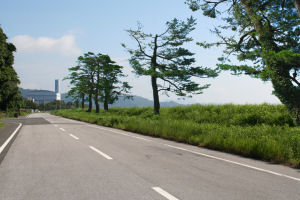 | 下の写真は東浜番匠川河口の道路ですが ここに松を植えたらどうなるか パソコンを使って松並木を合成してみました 写真をクリックしてそのパノラマをご覧ください |