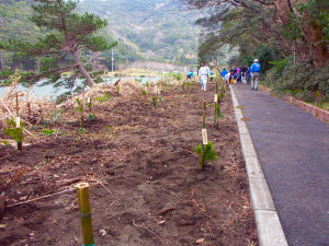 今回 米水津間越の潟湖周辺に松食い虫にも強いクロマツの苗100本を植樹しました
