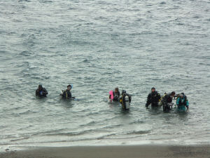 海岸ではスキューバーダイビングの若い方達が潜りに来ています