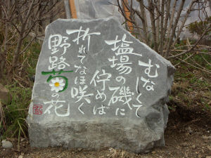 この塩場で働く人が時間のあるときにこつこつ作った石碑があちこちにあります