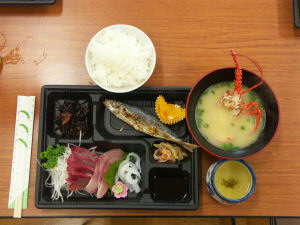 昼食の時間です ブリやイカのお刺身と焼き魚伊勢エビの味噌汁