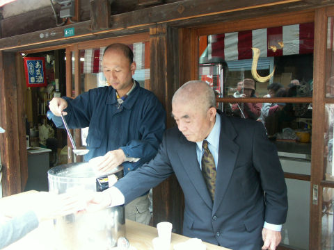 こうじ屋さんまえで甘酒とぜんざいのお接待を受けました