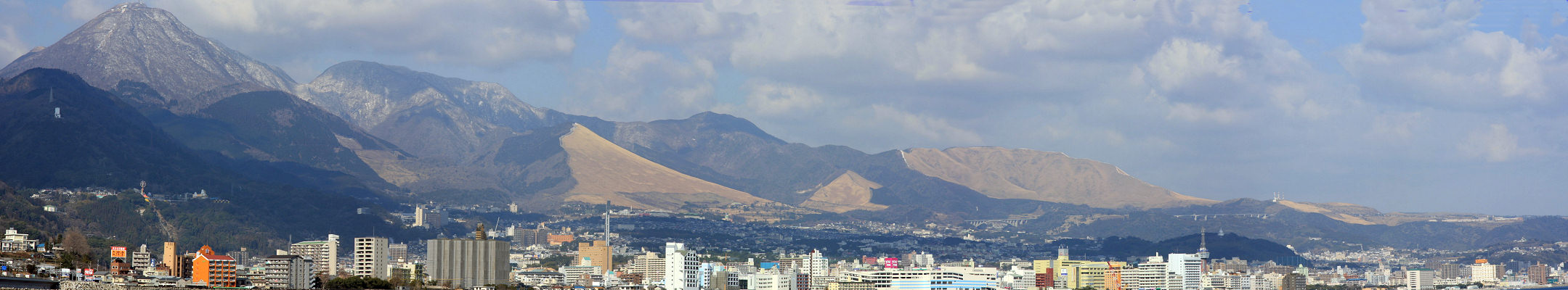 別大国道から見た冬の鶴見岳と別府市街