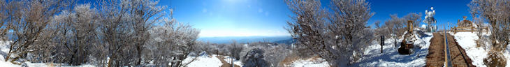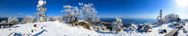 真冬の山頂では氷点下5度以下で霧が木々に凍りついて出来る霧氷を見る事ができます