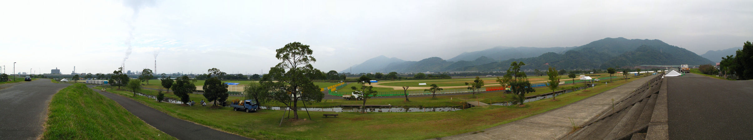 2010年10月13日 夕方の球磨川スポーツ公園です 毎年ここでは「やつしろ全国花火競技大会」が 開催されます 九州では唯一のプロの花火師の大きな競技大会ということです この広いスポーツ公園は花火観覧席となるのでしょう テントや仮設トイレなどが運び込まれていました。