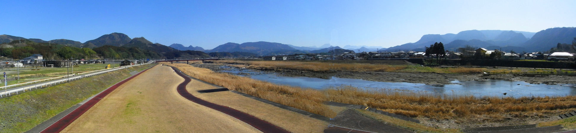 2010年2月28日 玖珠川河川敷から凧をあげて空撮した画像4枚をパノラマ合成しました。