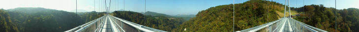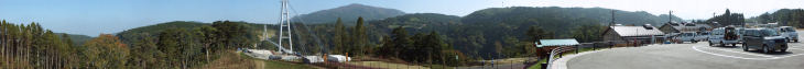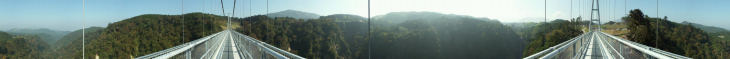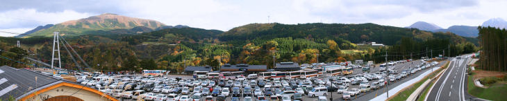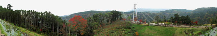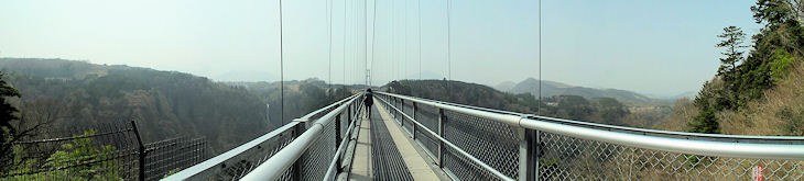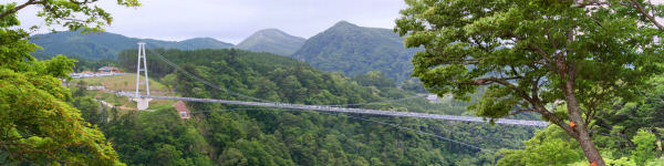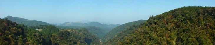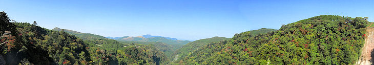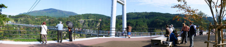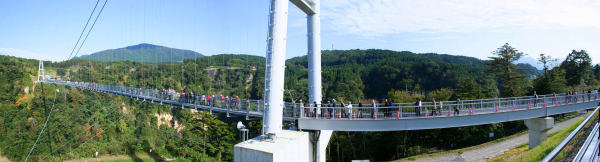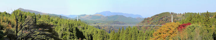 玖珠川上流の鳴子川渓谷にかかる「九重”夢”大吊橋」は長さ390m 高さ173mで人道専用の吊橋としてはいずれも日本一の規模で、観光客も多いところです。 吊橋の中央付近からは 日本の滝百選の震動の滝 男滝と女滝二つの滝を同時に眺める事が出来ます。