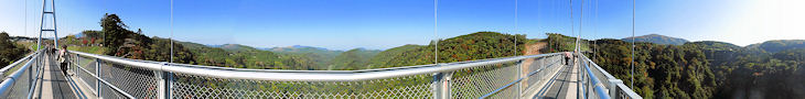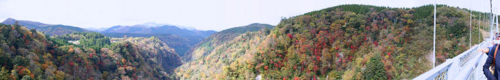 九重”夢”大吊橋から渓谷の紅葉を眺める 渓谷の水面まで高さ173m