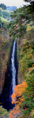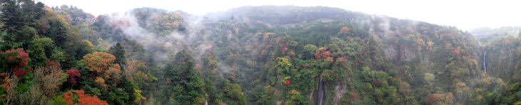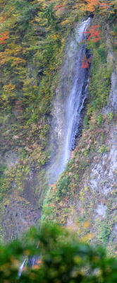 小雨の吊橋から見た紅葉と震動の滝 女滝と男滝です