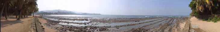 青島周辺は鬼の洗濯岩と言われる波状岩を従え、島内はビロウなどの亜熱帯植物が生い茂っています。
