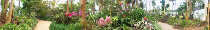 熱帯性大温室には、トックリヤシ、大王ヤシ等のヤシ類、果樹園、洋ランなど64科429種