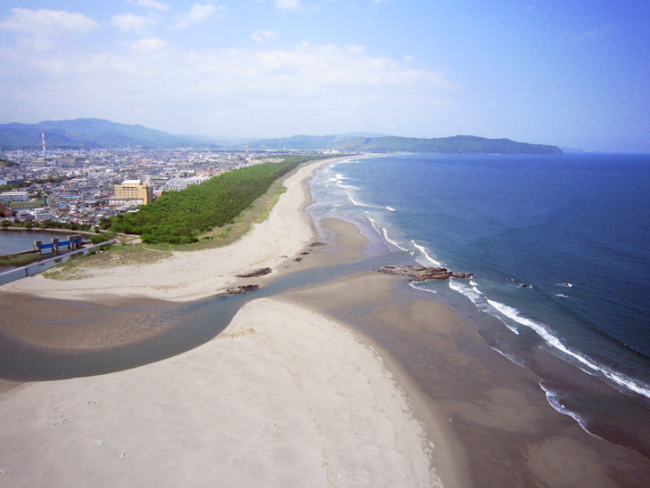 2014年4月 延岡市の万財海浜公園から凧を揚げて五ヶ瀬川の河口を空撮しました