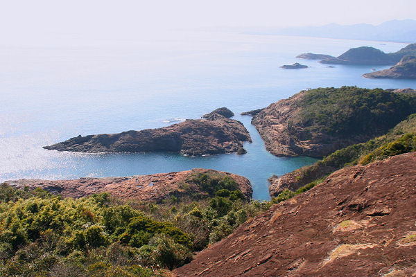 丘の展望台から遥か下の海を眺めると 十字架(クルス)のような見事な自然の造形です 向こうの小岩も見立てると叶うという文字にも見える事から 「願いが叶う」クルスの鐘もあり 鐘を鳴らす若いカップルの願いが叶うそうですよ 管理人は健康を願いました