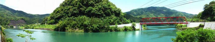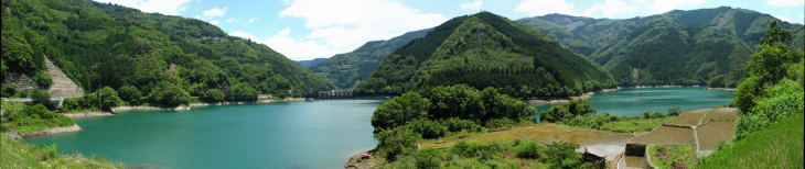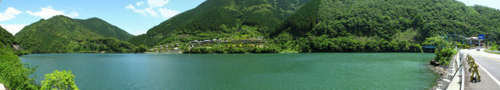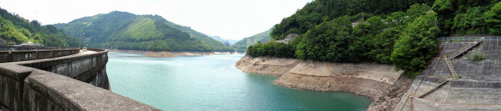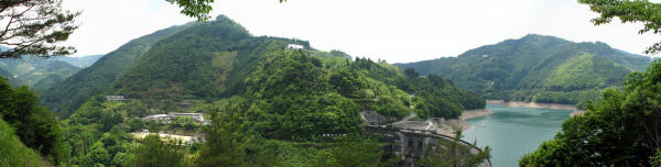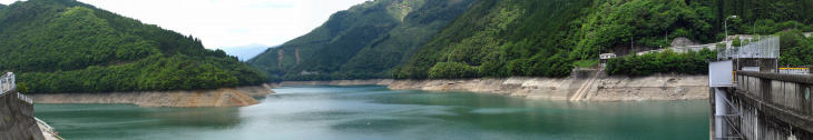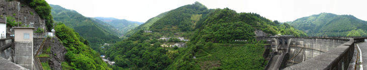 | 上椎葉ダムは昭和30年に完成した日本最初のアーチ式ダムです ダムの高さは110mダムの長さは341mで9200万立方mの水を貯められます。 |