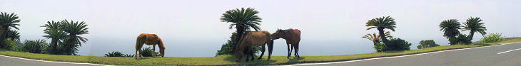 都井岬 野生馬で知られるこの馬は高鍋藩が軍用馬として放牧を始めたものが、後に野生化したものであり、