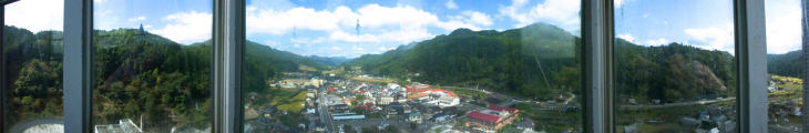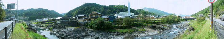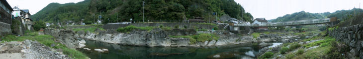 旧山国町のパノラマ風景です。 猿飛千壷峡の甌穴群は山国川の清流が長い年月をかけ安山岩を削り大小様々な 丸い穴をあけていて面白い眺めです。 その下流には魔林峡といわれる景勝地です。コアやまくにはガラス張りのタウンホール スケートリンク・図書室など備えた複合文化施設で近くには建築年がはっきり分かっている 九州最古の木造家屋神尾家住宅もあります。