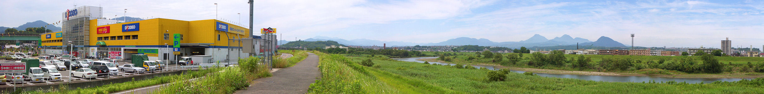 府内大橋の南側堤防から由布・鶴見・高崎山を望む