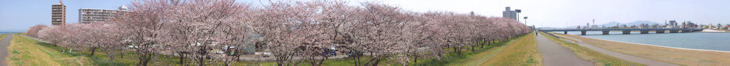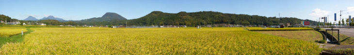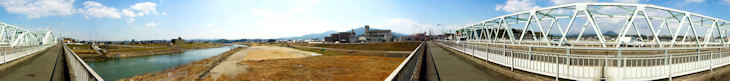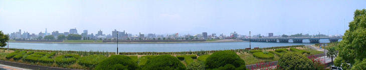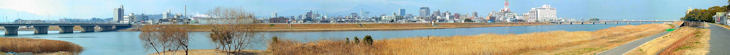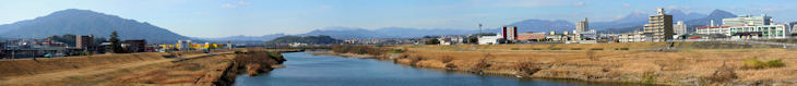 大分県中部を流れる大分川と周辺の大分市内でのパノラマ写真です。