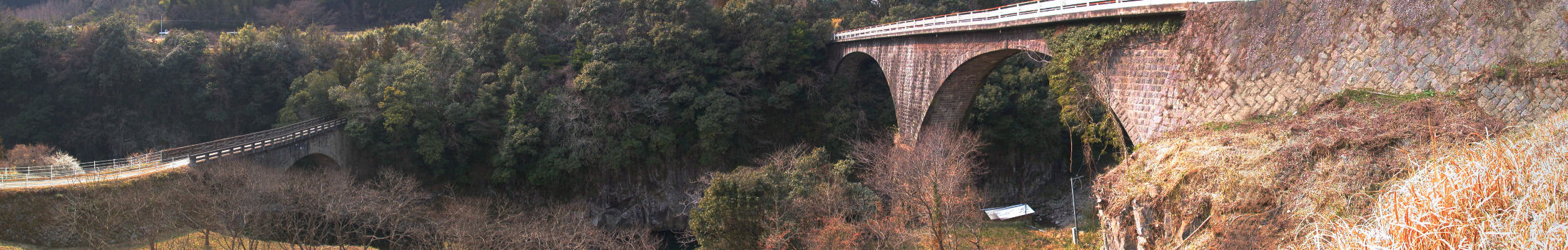 わずか80m離れて日本で一番と二番のロングスパンアーチの石橋が並んでいる光景です。 轟橋は高さでも水面から27m日本一、轟橋は営林署の軌道用に架設された橋ですが、現在は道路橋として使用。 轟橋は二つのアーチを持ち、広い方の径間は32.1mです、狭い方でも26.2m。 画面左の出合橋は径間が29.3mで二位です、こちらは元来道路橋として作られました。 柱状節理の絶壁にかかった日本一と二位の石橋です。