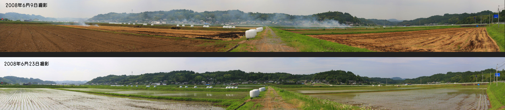 2008年6月9日とわずか2週間後の6月23日の風景を比較 麦の収穫が終わったと思ったらもう田植えです。