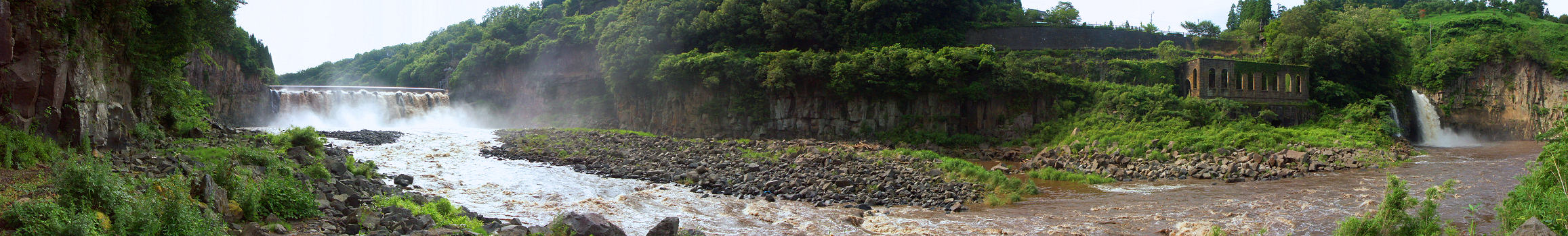 梅雨時期の沈堕 雄滝(左)から雌滝(右)まで