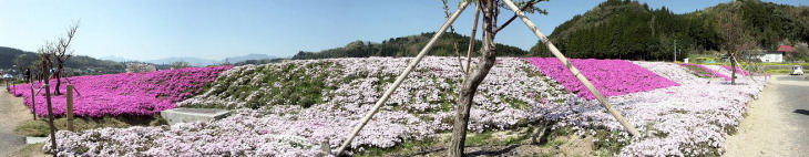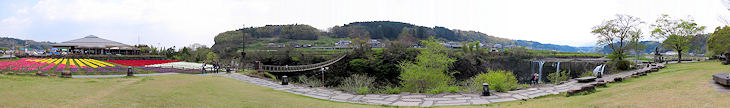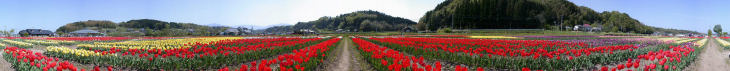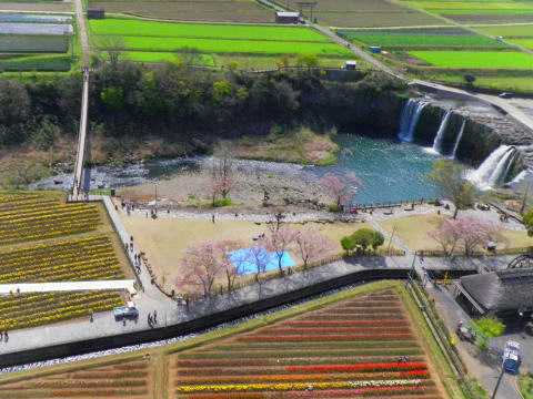 日本の滝百選の原尻の滝周辺の田んぼが80種、50万本のチューリップで彩られる花の祭典です。