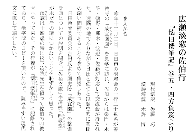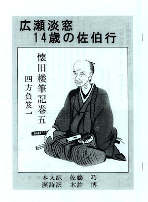 | 広瀬淡窓は江戸時代の儒学者で、教育者、漢詩人でもあります 天明2年(1782年)日田の博多屋長男に生まれ、 幼少から学問を好み勉学していました。 病弱だったため 家業は弟広瀬久兵衛に譲りました 現在の大分県知事広瀬勝貞は弟広瀬久兵衛の子孫になります。 淡窓14歳の時 それまで師であった松下筑陰先生が佐伯藩の 四教堂に移られたので先生を慕って佐伯まで旅をします。 今回 四教堂塾のメンバーと 広瀬淡窓が通ったであろう道を 辿って咸宜園から佐伯市まで車でですが 同じ道を走ってみました。 淡窓の佐伯までの行き帰りの行程が 「懐旧楼筆記」に記録されているのです。 「懐旧楼筆記」を読むのは私たちには難しいので 四教堂塾の佐藤巧塾長が現代語訳 漢詩の解読は木許博氏が行い右のような 冊子を作成しました。 |