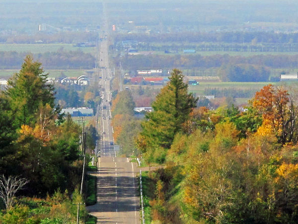いくつもの丘を越えてまっすぐ伸びる北海道の道