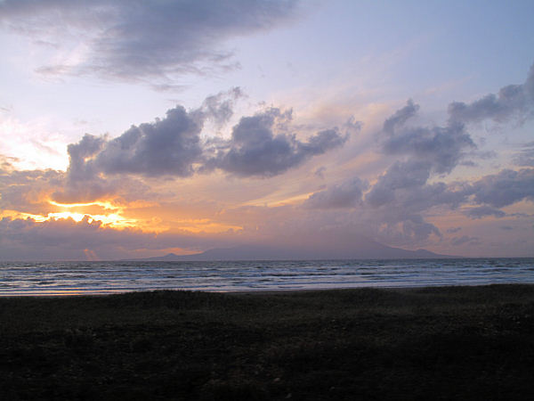 日本海に沈む夕陽と利尻島 利尻富士の頂上が見えなくて残念